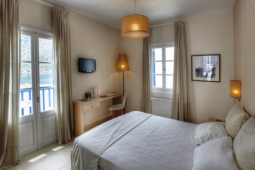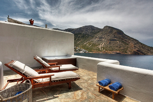 Superior double room's private veranda with outdoor Jacuzzi tub and view of Kamares bay