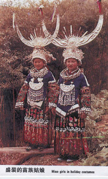 Miao minority girls (Guizhou) wearing silver head-dresses in buffalo horns style. "The Miao people believe the buffalo has the power to ward off Evil spirits". |