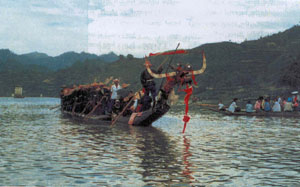 A dragon canoe of the Miao with a buffalo-dragon head.