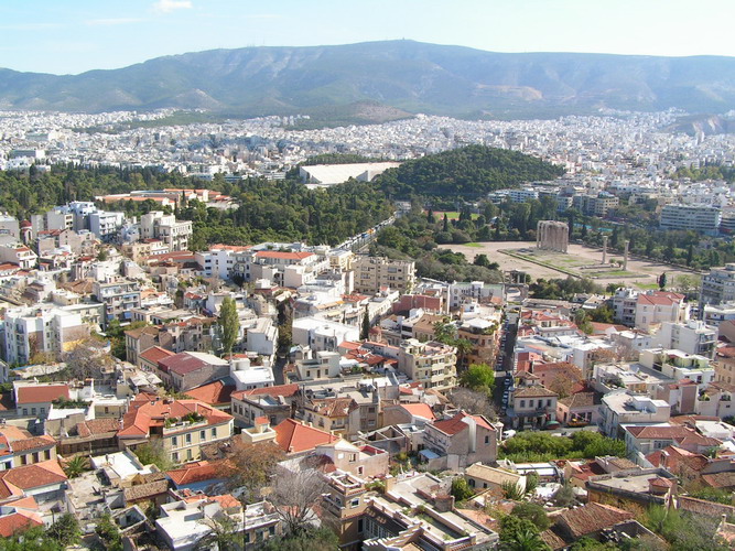 东面俯瞰哈德良之拱(Hadrian's arch),奥林匹亚宙斯神庙(Temple of Olympian Zeus),位于国家植物园的Zappion宫殿和古代奥林匹克运动场。
