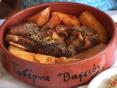阿尼米帕塔提斯玛斯特罗(Arni Me Patates Mastelo)——羊肉和马铃薯 [里斯沃斯岛(Lesvos) 莫利沃斯(Molyvos) 的巴非欧斯餐厅(Bafeios)] |