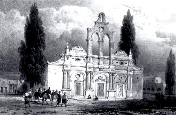 A longer trip would include Arkadi, Eleftherna and Margarites, connected in a loop running into the hills southeast of town. Arkadi, shown in the 19th century drawing by Robert Pashley, is a graceful baroque monastery built of mellowed golden stones, is a must for every Greek traveller to Crete as it is the ultimate symbol of
