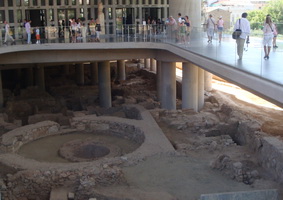 and buildings is a great idea, in fact they should do this with all of Athens though probably if you had glass sidewalks they would soon be covered with gum and scuff marks and eventually you would not be able to see anything. But it kind of works in the Acropolis Museum though I think they should have used magnifying glass so you feel closer to the ground and can see more detail. Not that there is much to see. It just looks like the building is suspended over a construction site actually. But if you keep reminding