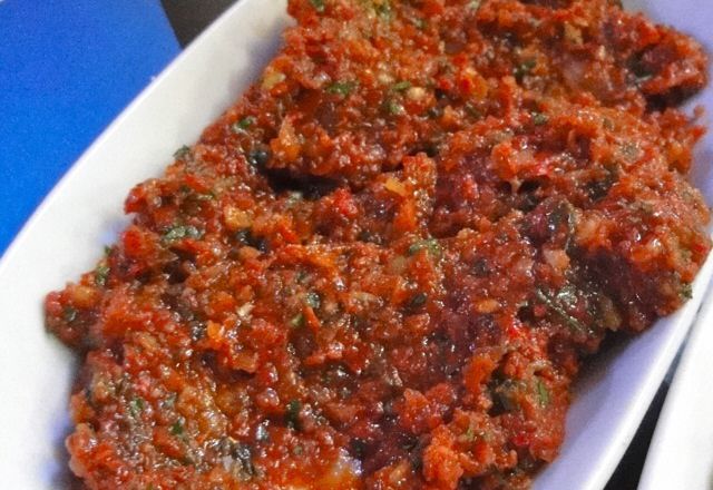 Ezme: Pepper and tomato salad. It is served cold and you dip your bread in it or spread it on your bread if you want to be more hygienic.